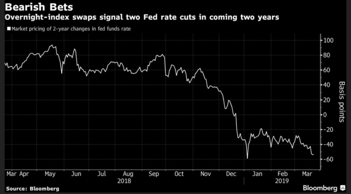 Overnight-index swaps signalisieren, dass die Anleihe-Händler nun bis zum Ende des nächsten Jahres mit zwei Zinssenkungen durch die Fed rechnen, Graph: Bloomberg, March 24, 2019