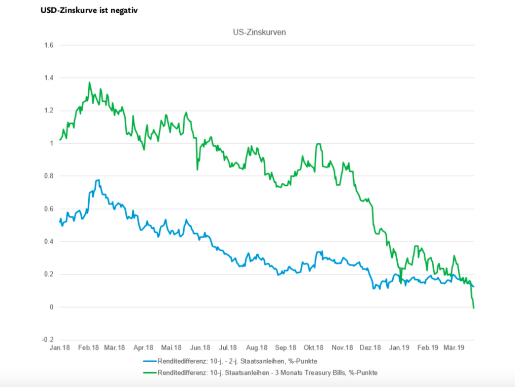 Die Preise der Anleihen steigen und die Renditen fallen. Die Zinskurve (yield curve) in den USA ist sogar am vergangenen Freitag zum ersten Mal seit 2007 invers geworden.