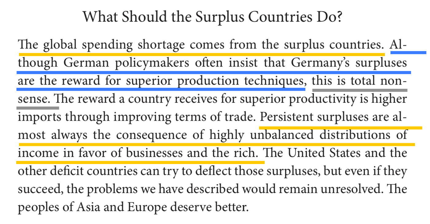„Obwohl deutsche Politiker oft darauf bestehen, dass die deutschen Überschüsse die Belohnung für überlegene Produktionstechniken sind, ist dies völlig unsinnig. Die Belohnung, die ein Land für überlegene Produktivität erhält, sind höhere Importe durch Verbesserung der Handelsbedingungen. Anhaltende Überschüsse sind fast immer die Folge einer sehr unausgewogenen Einkommensverteilung zugunsten von Unternehmen und Reichen“, schreiben Pettis und Klein.