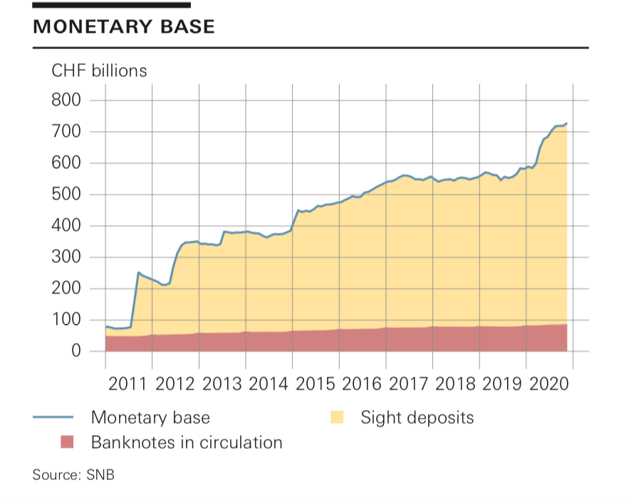 Zum Vergleich: Im November 2008 belief sich die entsprechende Summe auf 55,6 Mrd. CHF. Die Geldbasis (base money) hat damit in 12 Jahren um das 13-fache zugelegt.