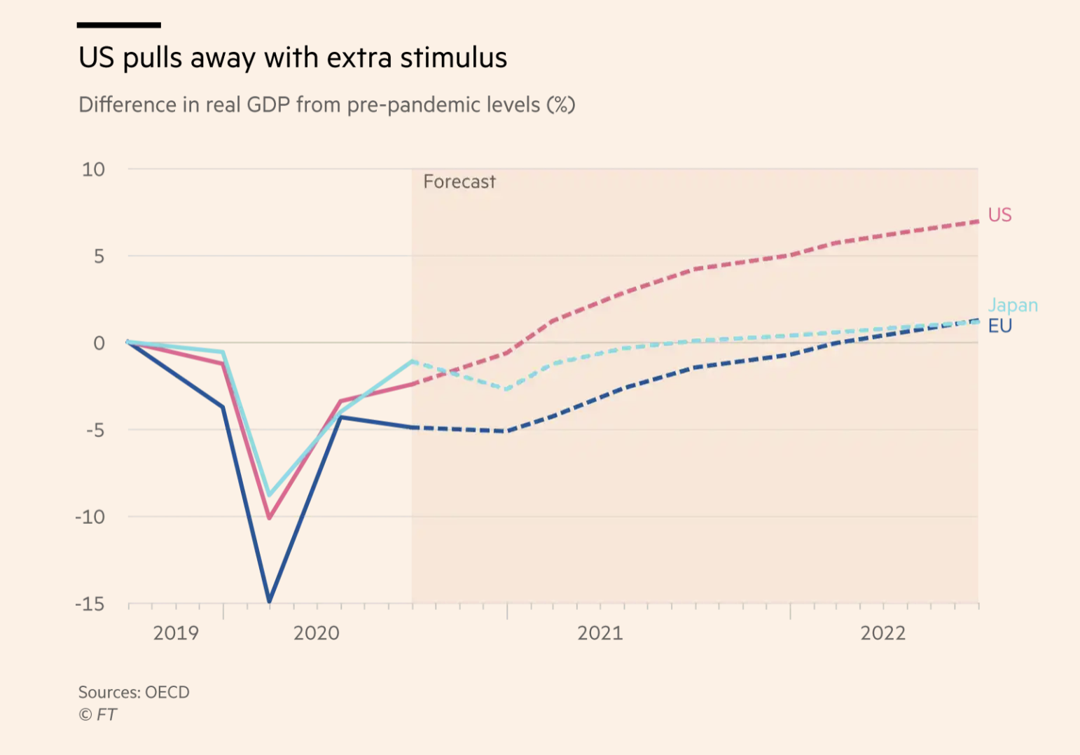 Die USA ziehen mit zusätzlichen Stimulus-Massnahmen davon Der Unterschied im realen BIP gegenüber dem Niveau vor der Pandemie, Graph: Financial Times, 16 März 2021 @FT