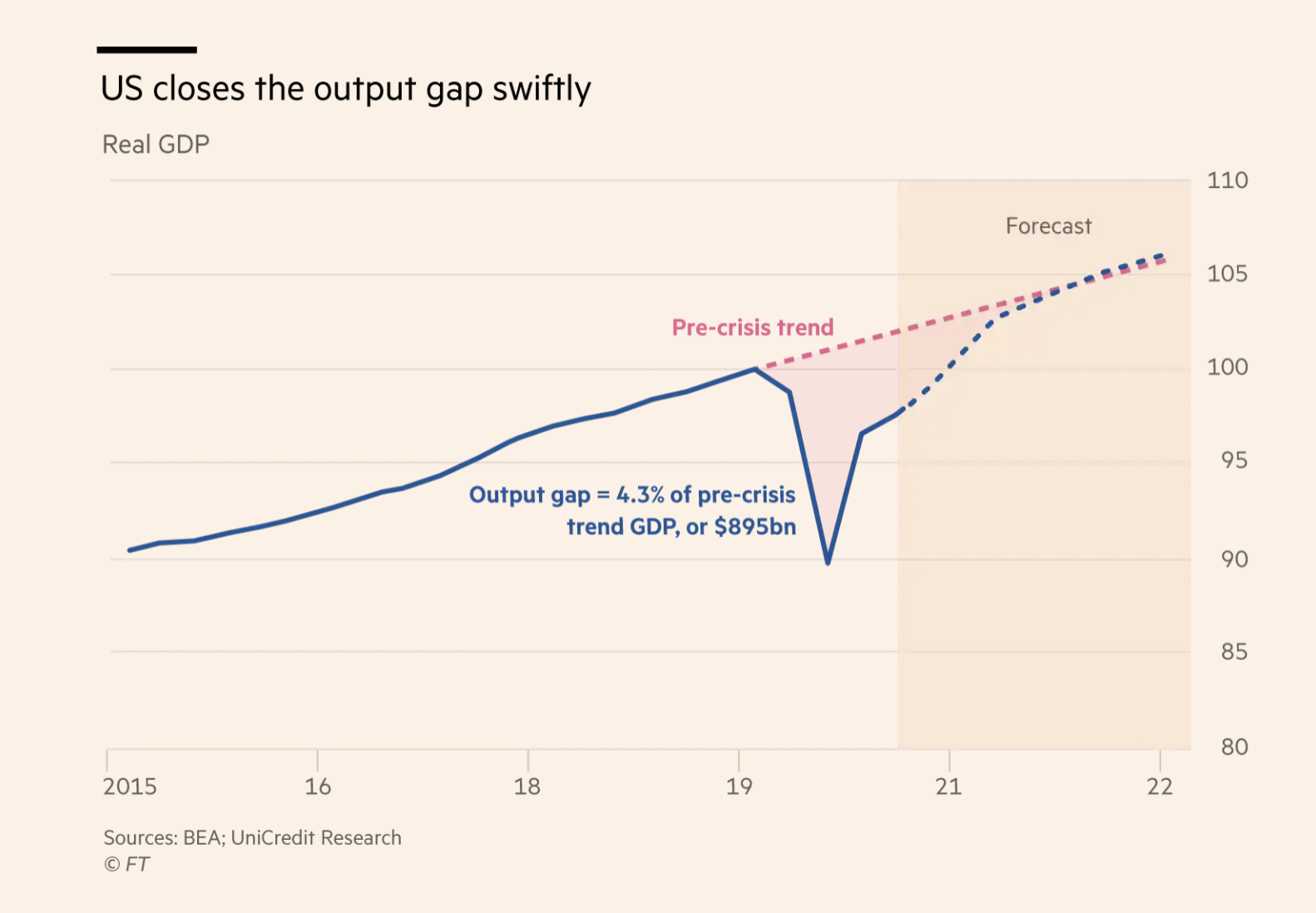 Die USA schliessen zügig die Produktionslücke (output gap), Graph: Financial Times, 16 März 2021, @FT