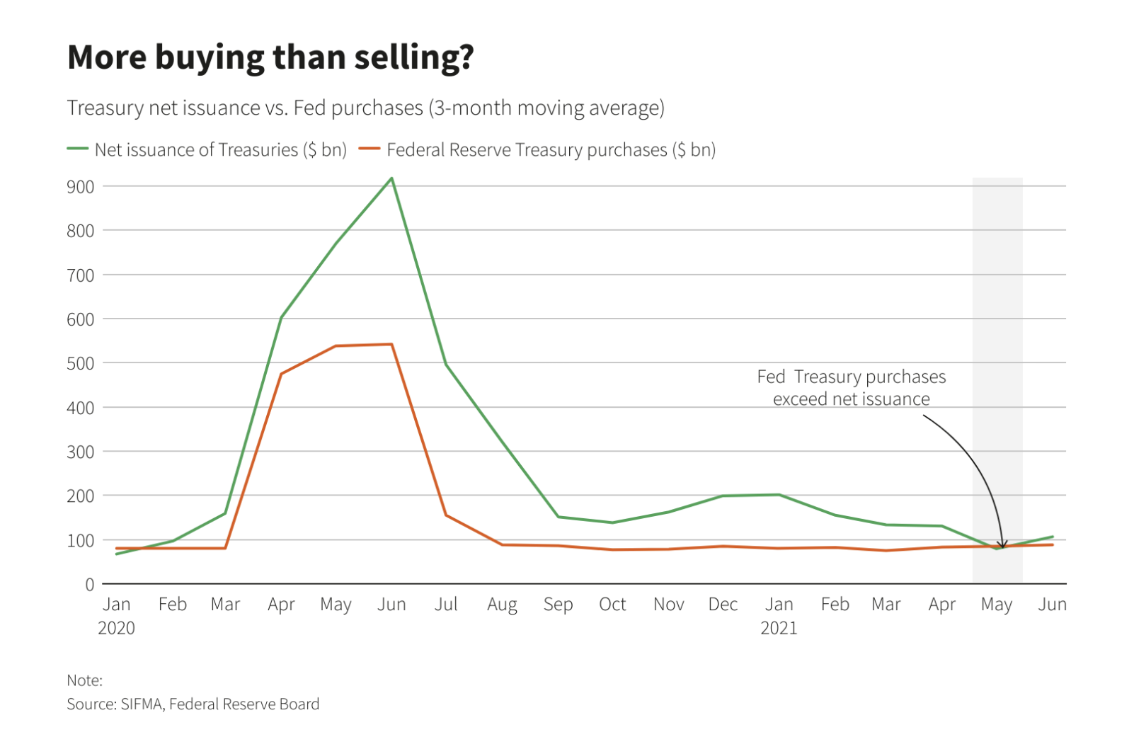 Die Grafik zeigt auf Basis eines gleitenden 3-Monats-Durchschnitts die Käufe von US-Treasuries durch die Fed im Vergleich zu den Nettoemissionen von US-Treasuries, Graph: Ritvik Carvalho, Reuters, July 08, 2021