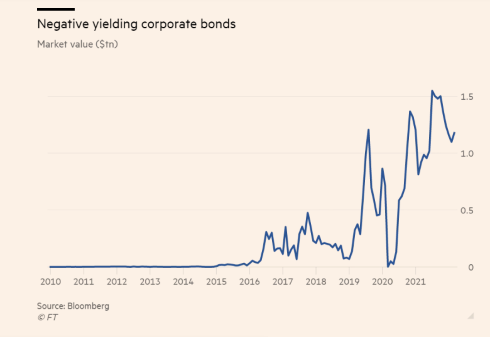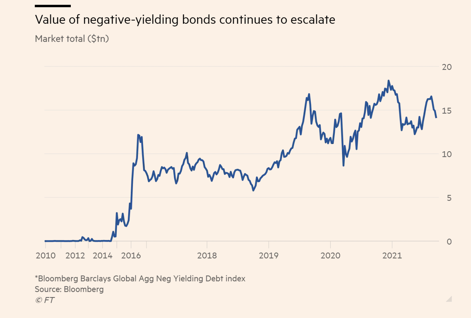 Der Wert der weltweit negativ verzinsten Anleihen beläuft sich derzeit auf 11'800 Mrd. USD, Graph: FT, Sept 27, 2021