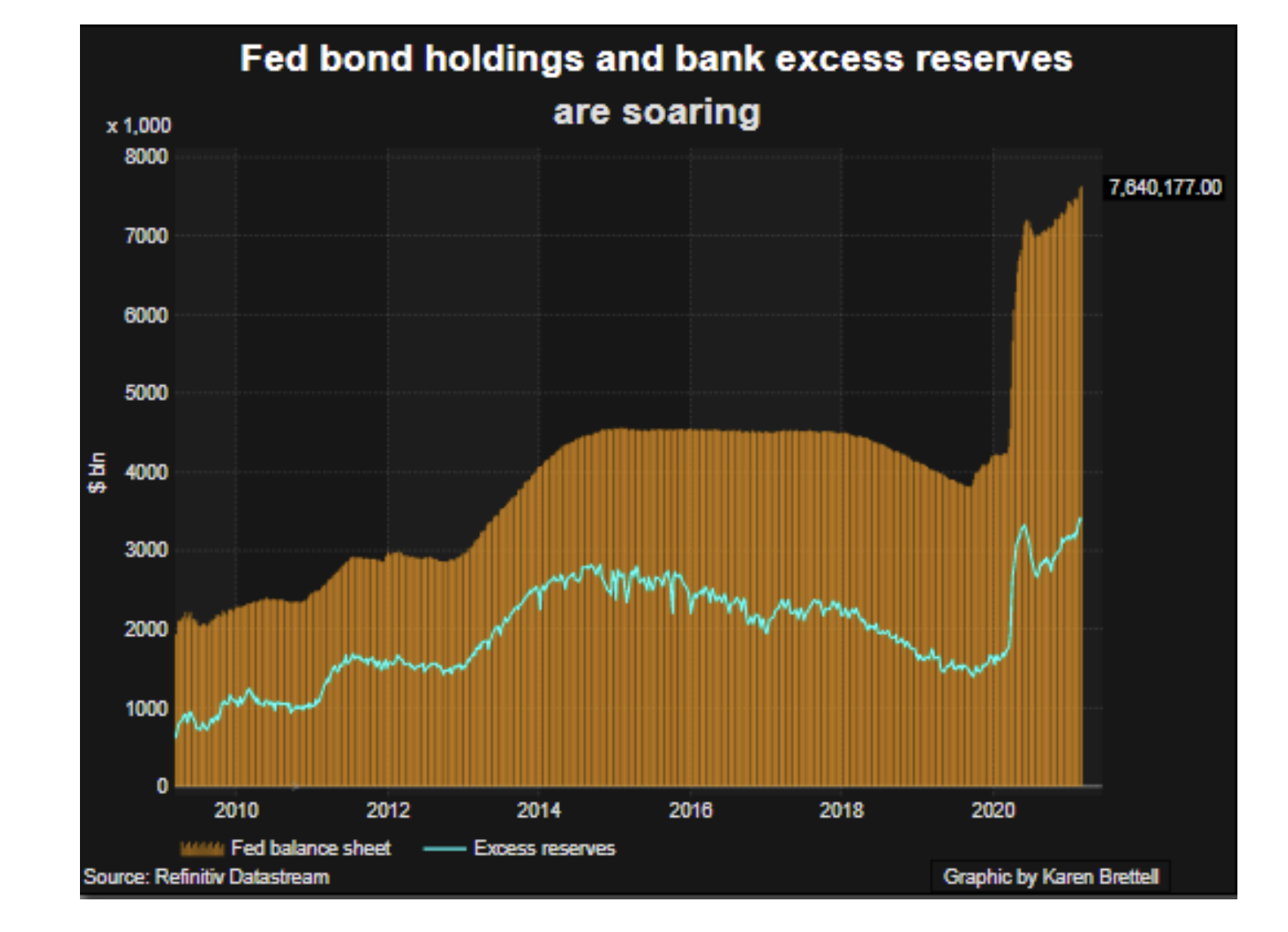 Fed bond holdings and bank excess reserves, Graph: Reuters, 16. März 2021
