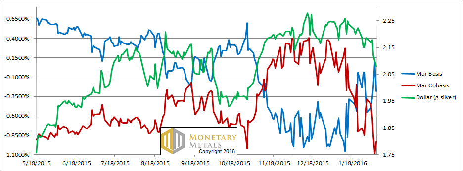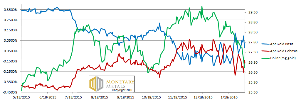 The red cobasis line (i.e. scarcity) is overall tracking the price of the dollar in gold (i.e. the inverse of the gold price). In other words, as the price of gold rises, the metal becomes less scarce. However, notice that move up on Friday. The cobasis did not close much below last Friday’s level, despite the price of gold moving up sharply.