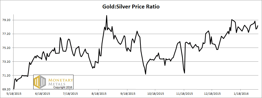 Next, this is a graph of the gold price measured in silver, otherwise known as the gold to silver ratio. The ratio was volatile this week, first up and then down, but it ended down but a smidge.